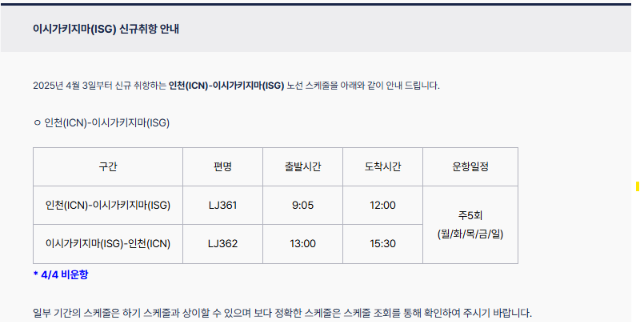 진에어의 이시가키지마 취항은 4월 3일부터 시작됩니다. 주 5회(월, 화, 목, 금, 일) 정기 편이 운항되며, 인천국제공항에서 오전 9시 5분에 출발하여 현지 정오에 도착합니다. 귀국 편은 오후 1시에 출발하여 인천에 도착하게 됩니다.